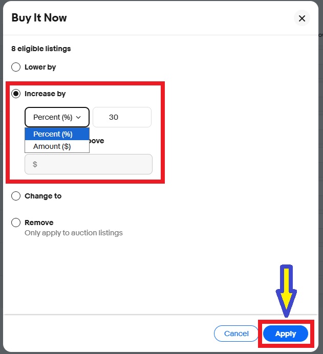 「Percent(%)」を選んで数値を入力すると○%の値上げ、「Amount($)」を選んで数値を入力すると○ドルの値上げ、という設定になります。