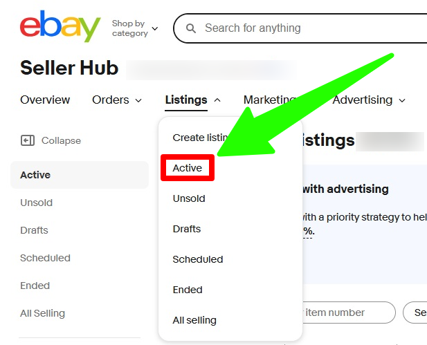 まずはebayセラーハブで「listings」にカーソルを合わせて 「Active」をクリックします。