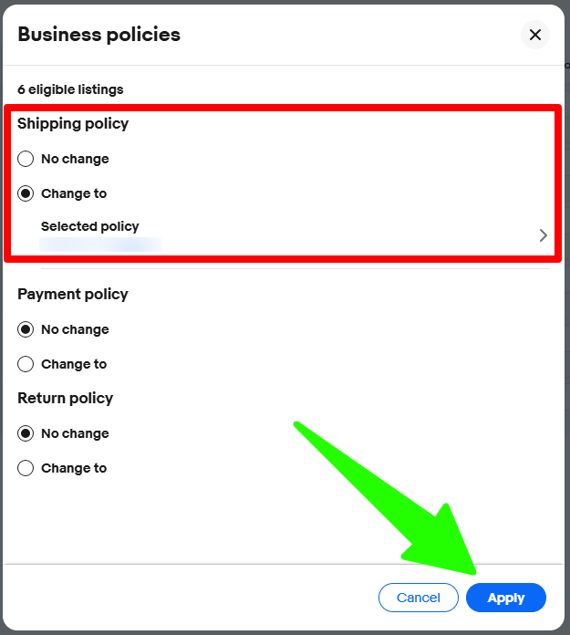 価格を変更する場合は「Buy it now」をクリックします。シッピングポリシーを変更する場合は「Shipping policy」をクリックします。